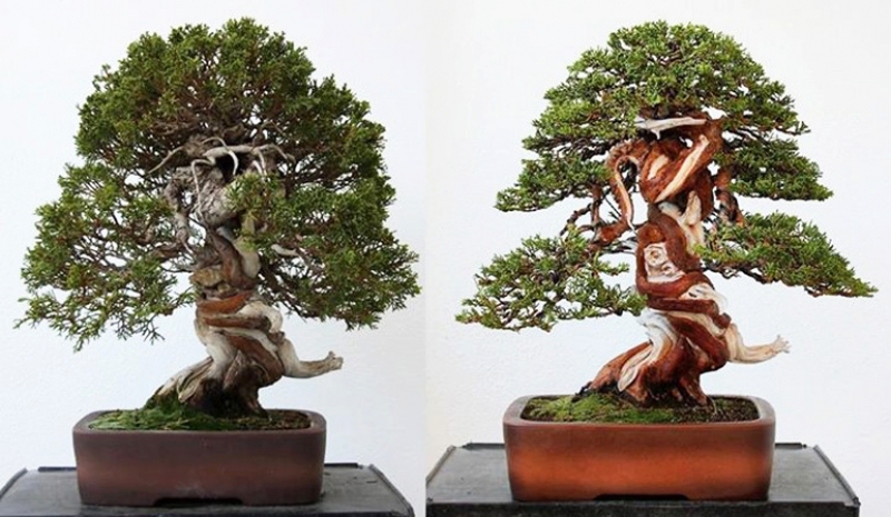 The Monk, Bonsai Before & After 8/2/18 Before and after by Salvador De Loy Reyes. He calls it The Monk, but gives no other information, including no species (looks a lot like a Shimpaku juniper) or details of any kind, though you might guess it was originally field grown and purposely twisted to loo...