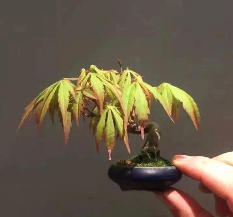 Hand Held Bonsai & a Glass of Good Red Wine 9/23/18 The leaves are very large in relation to the size of the tree, but this often happens with small bonsai and seems to work. At least in this case and many others I've seen. No variety is given, but clearly this is a Japanese maple. I cropped this ph...