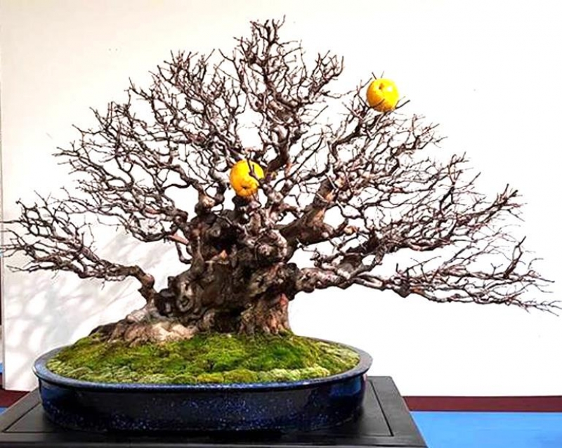 Korea Bonsai Artists Exhibition 1/21/18 In addition to the strong trunk and nebari, there's so much dynamic and expansive movement with this tree. The fruit looks like what you might find on a Chinese quince (Pseudocydonia sinensis) and the tree could certainly pass, so quince is a safe guess. I don...