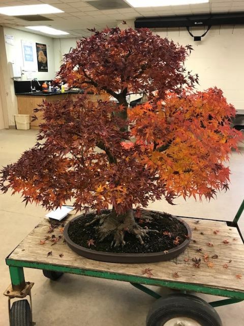 Incredible "before, during, and after" photos of the defoliation of a vibrant Japanese Red Maple at the Museum. Defoliating trees helps induce the growth of new branches and leaves, can lead to brighter autumn colors, and is one of the many techniques bonsai artists use to manage the balance and shape of a tree.