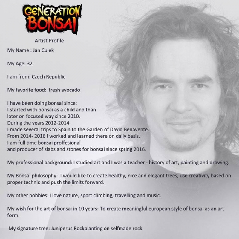 Czech wonder boy Jan Culek makes his second appearance on the Generation Bonsai stage, having found his way and place among europes top Bonsai artist, he also established himself as a producer of unique bonsai hardware. His name and his work spread quickly as they speak for him loud and clear.