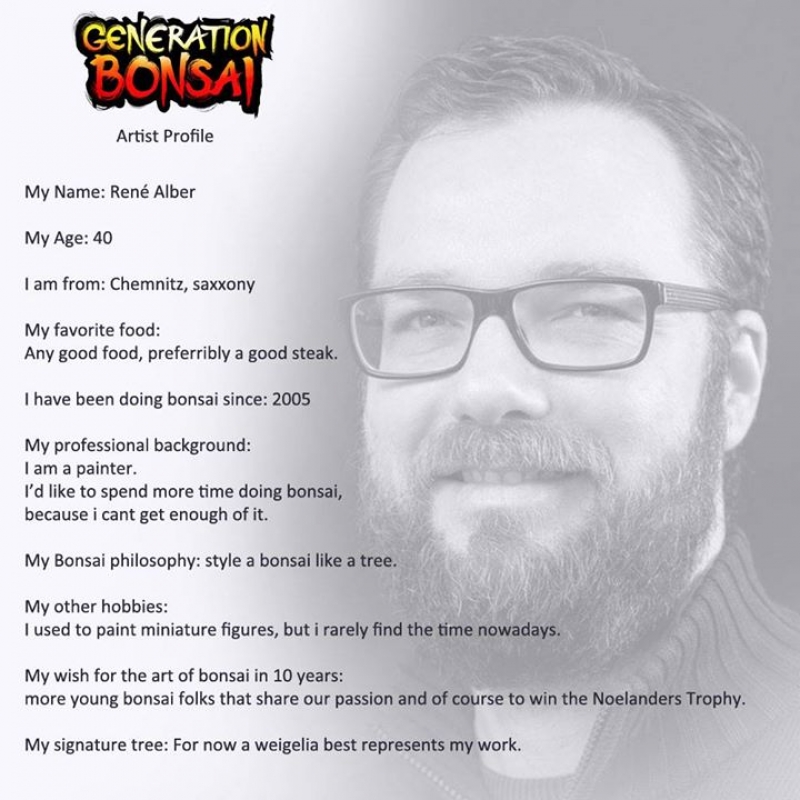 Growing up under the Wings of Walter Pall, he won the german national talent contest and his passion drives him to aim higher and higher working with europes finest artist. He entered the professional bonsai world with his passion and his ´Bonsai Gilde´ club. They run their own bonsai shop and produce their own bonsai fertilizer. His dream to become a fulltime bonsai professional carries him on this years main stage.