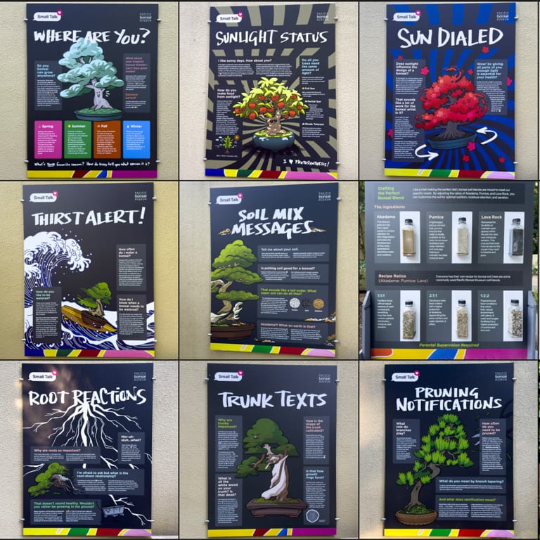 Framed as a series of questions and answers with the trees, the exhibit provides a basic Q&A aimed at children and their families. A collection of beautifully designed posters presents information about what bonsai need to grow and maintain their health, from light and water requirements to soil ingredients and root development.