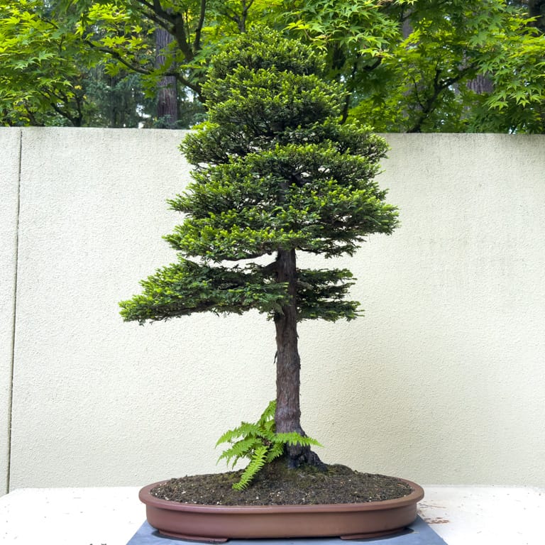 The coast redwood below was donated to the garden by Toichi Domoto, a well-known California nurseryman and bonsai grower. Domoto started this bonsai from a three-year old seedling in 1957 and trained it for thirty years before donating it to the Museum (learn more about Toichi Domoto).