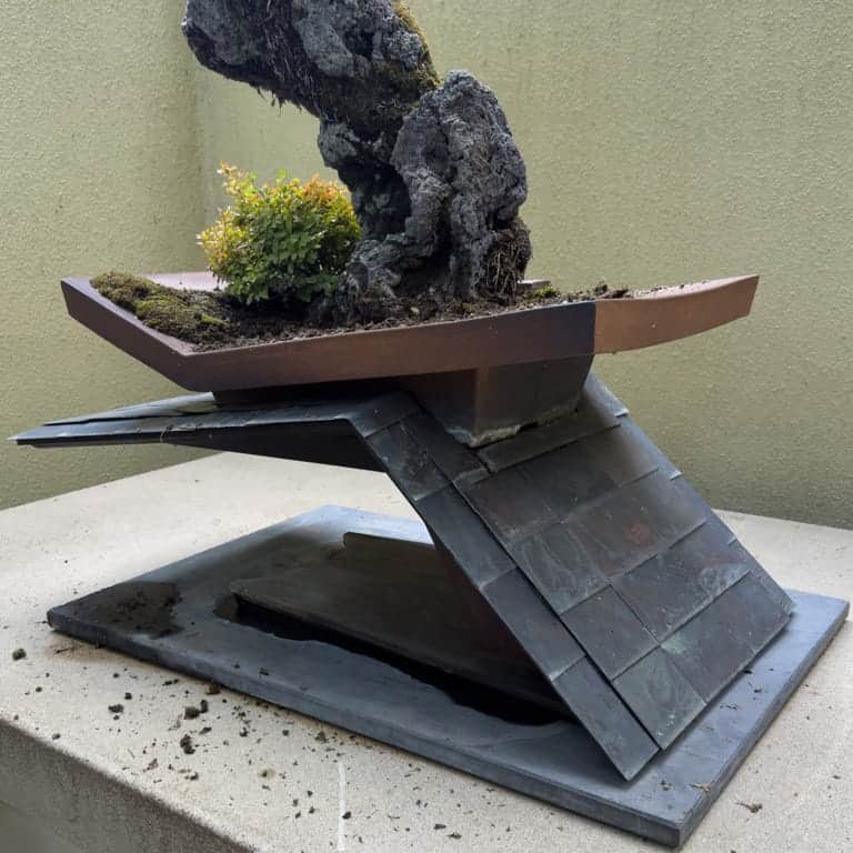 The composition below started with Lang’s container. Heitzman then created the stand to complement the container. Finally, in 2020, Neil planted the root over rock Douglas fir and this composition came to its initial completion.