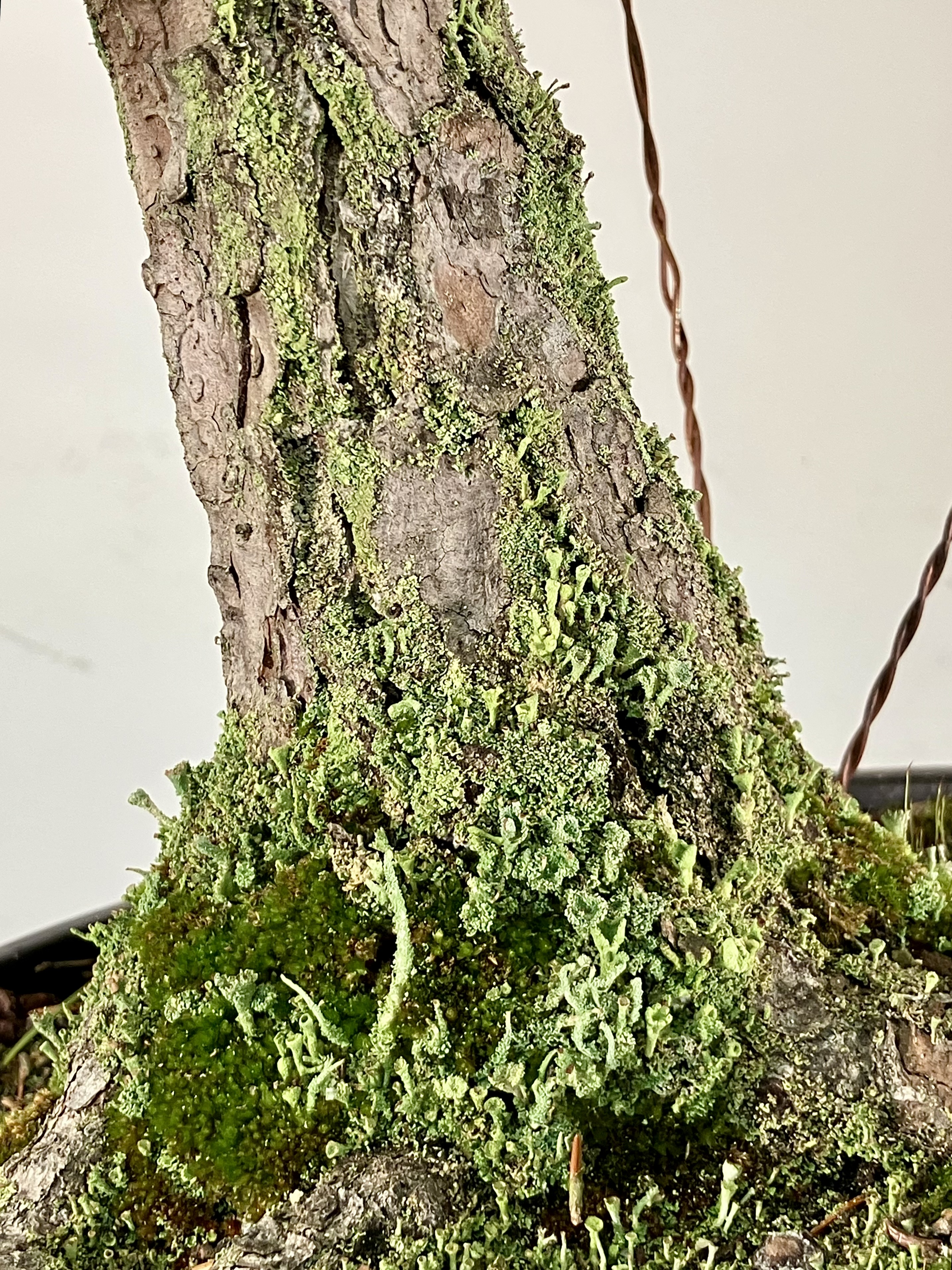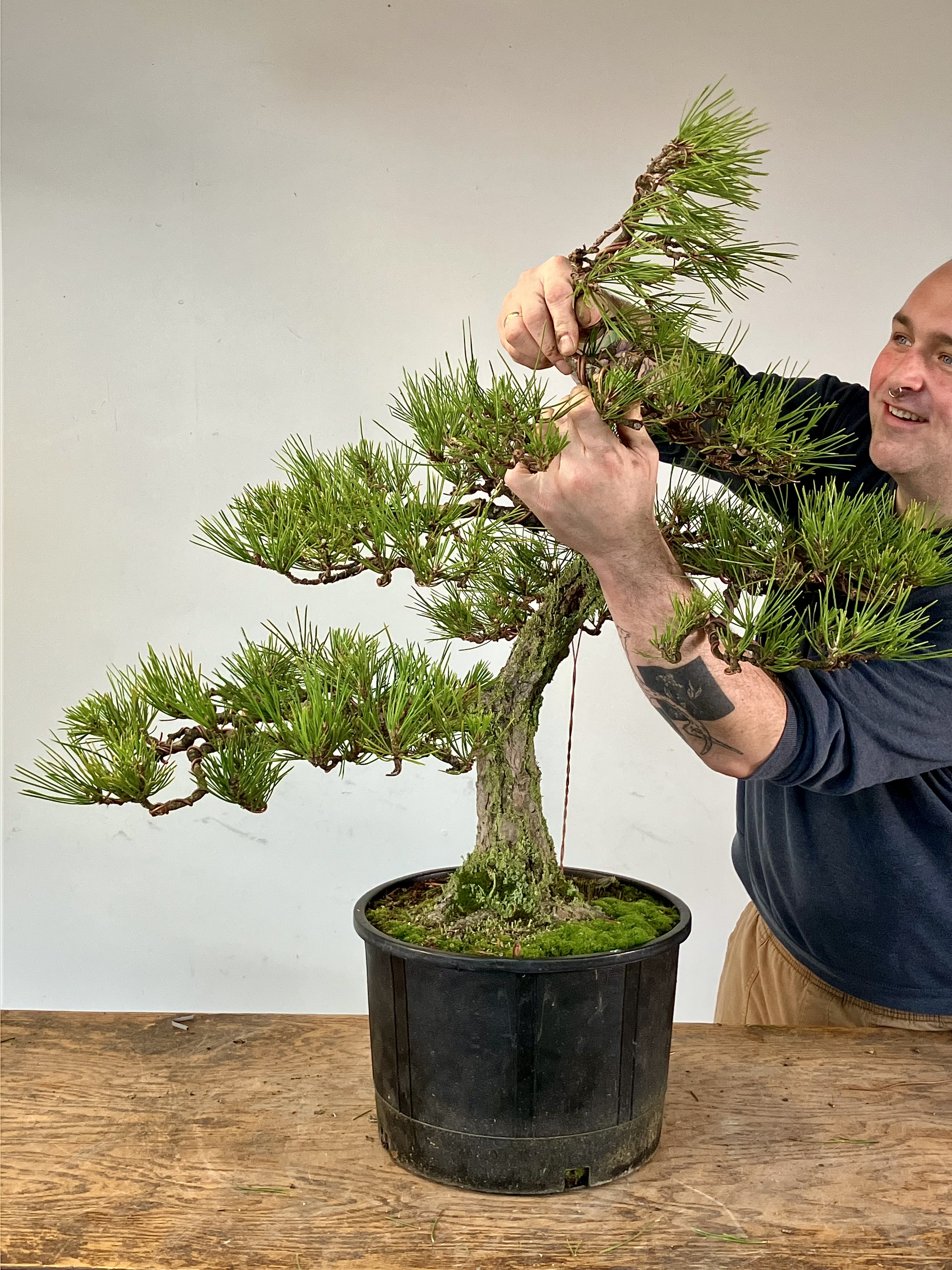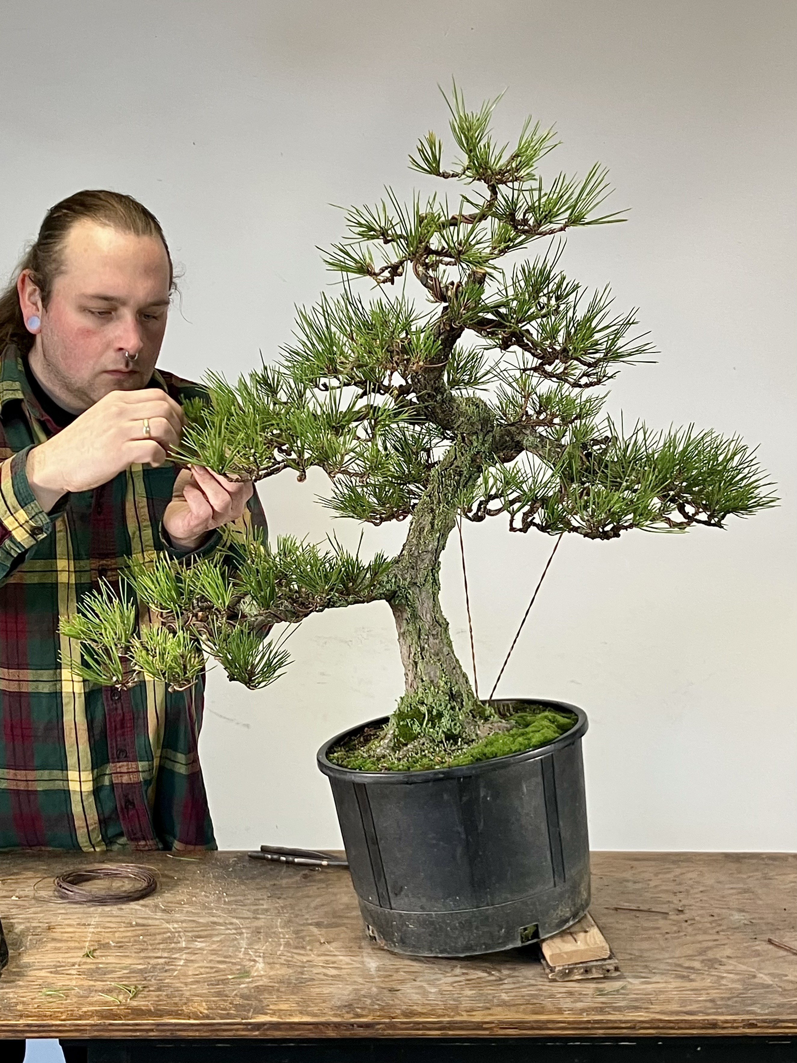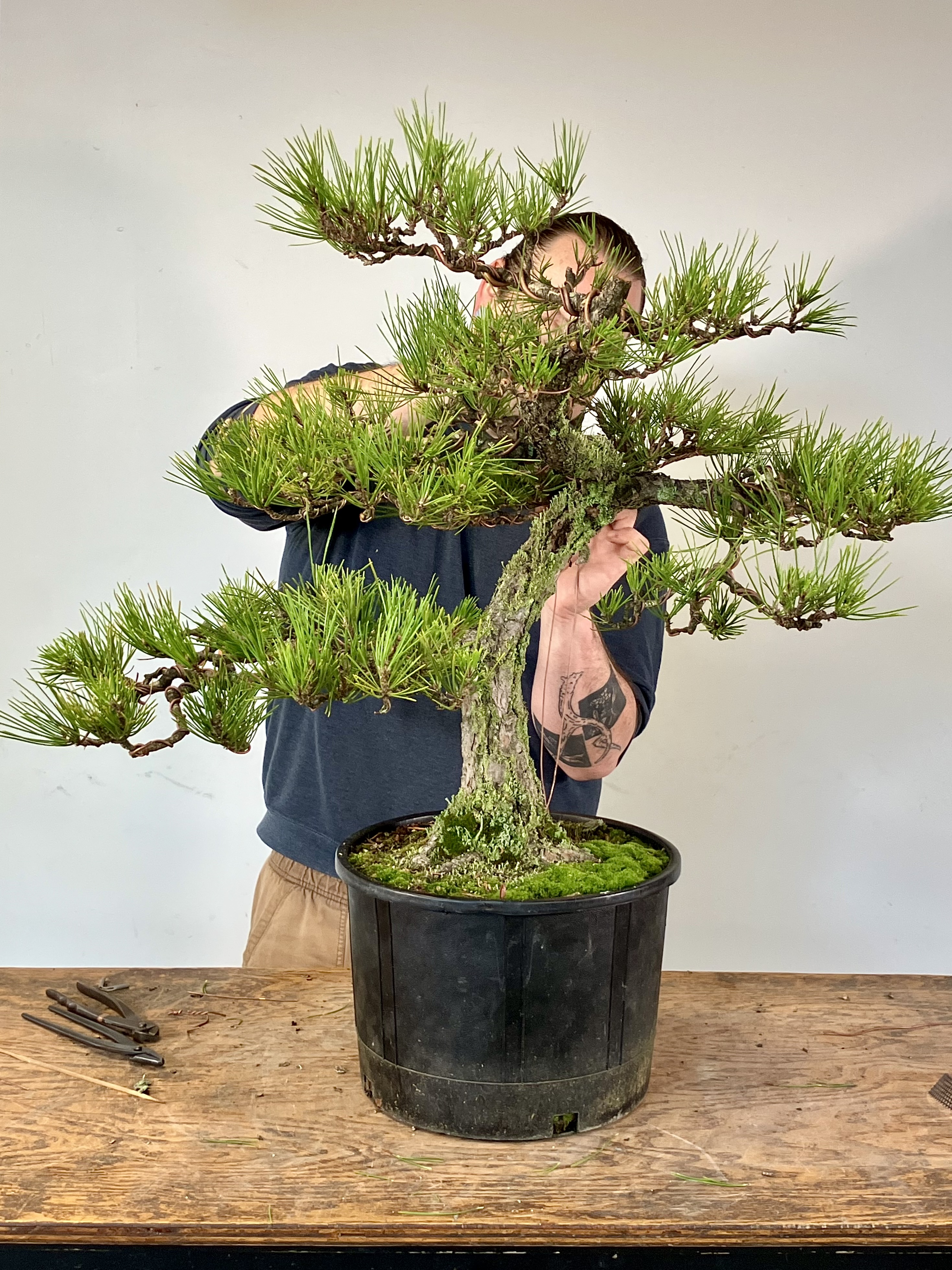 Bottom branches roughly set. Patch is tying a guy wire down to a big root. If possible, it’s best to tie guy wires to the tree itself rather than the pot so you can repot without cutting them off. Guy wires usually take several years to set.