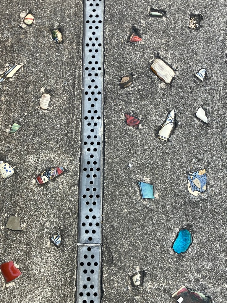 Back in Naha for the flight to Tokyo, I found this sidewalk with embedded broken pottery shards.